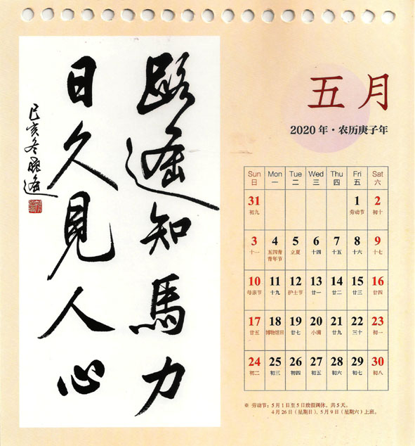 年末歲初,筆者收到了姚國培新出的2020年賀歲掛歷。這是一本設計新穎、制作精美、內容高雅、作品風格獨樹一幟的書法掛歷,用銅版紙印刷,每一幅作品都由姚國培自己創作、設計。