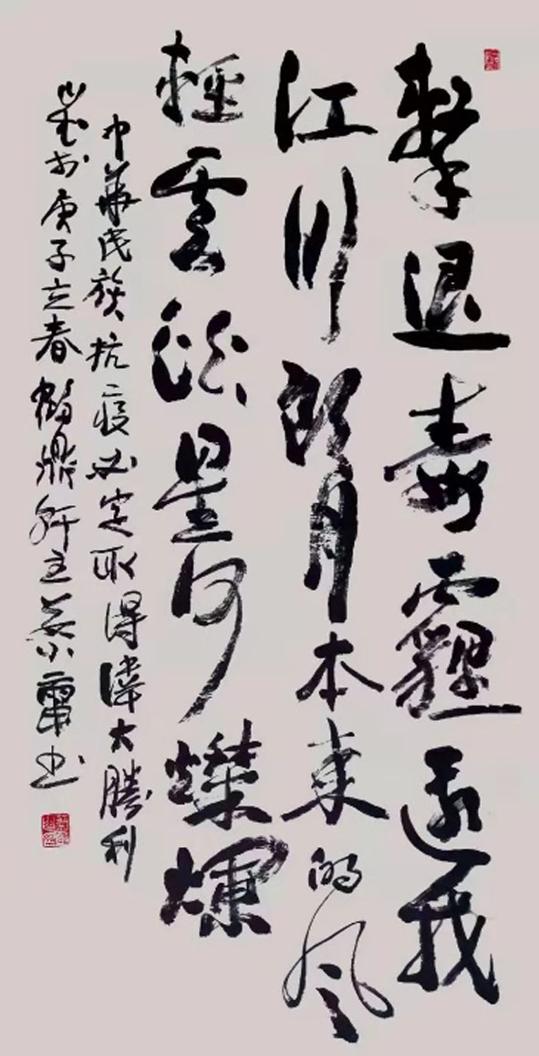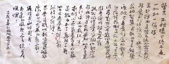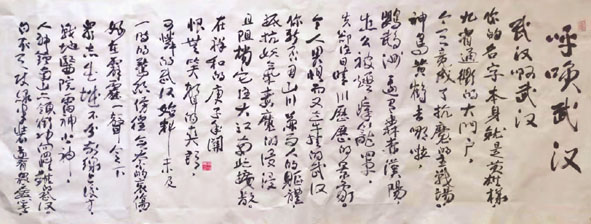 蔡爾申他不忘初心,牢記使命,心系武漢。以功底深厚、蒼勁有力,行云流水般的書(shū)法一氣呵成作出呼喚武漢的詩(shī)篇,充分體現(xiàn)出一位老共產(chǎn)黨員的擔(dān)當(dāng)與情懷。