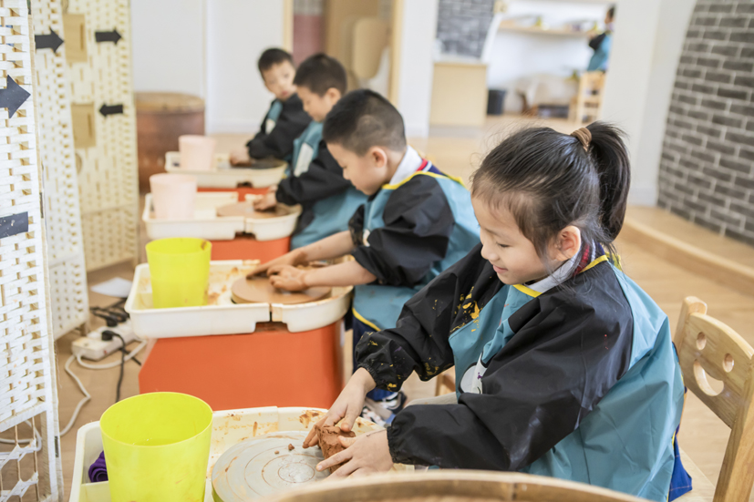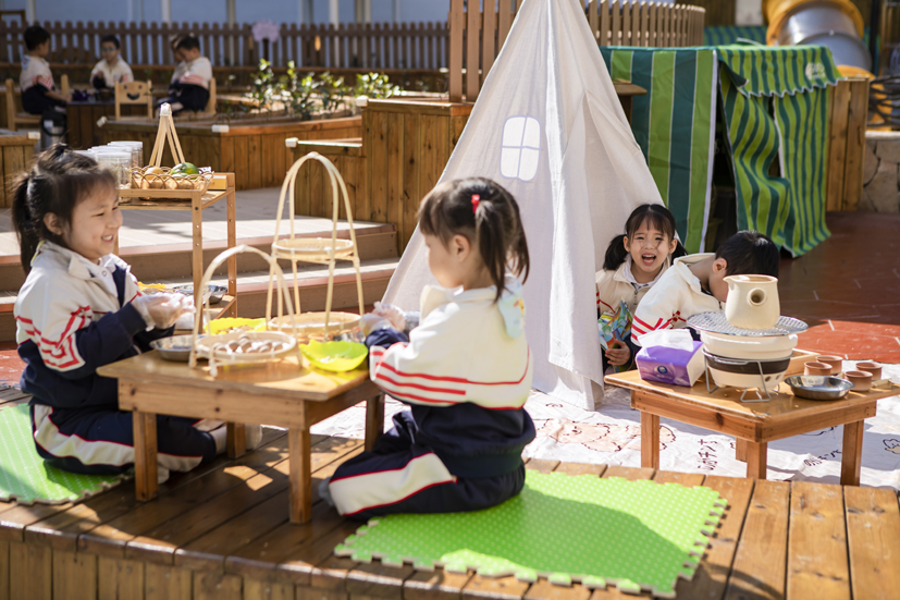 幼兒園在戶內外空間的建設、生活環境的創設、游戲材料的豐富等都以幼兒需要和興趣為導向,以幼兒發展為根本。在這個“樂園”里,師幼一起探索著身心快樂的要義,幼兒學會快樂生活、樂享游戲、樂于學習,獲得寶貴的成長經歷。而教師們愿意做“樂園”里的耕耘者,用心陪伴和用愛守護的支持者。順應兒童興趣需求,創設了探究的游戲環境,幼兒可以從室內玩到戶外,從地面玩到平頂;戶外有各類果樹、茶樹、花卉、蔬菜;有山坡隧道、戰壕堡壘、沙水管道、小橋坡道,這樣巧奪天工的天然設計,讓幼兒感覺到自然天成和身臨其境的情境教育;順應發展需求,創設可學習的游戲環境,有娃娃家、種植區、探究區、藝術區等,孩子們在草地里搭帳篷,石頭當鍋樹葉抵菜、拿著顯微鏡觀察茶葉的葉脈,在水池里用不同工具打撈泥鰍,在涂鴉墻上盡情潑墨,孩子們在原汁原味、不事雕飾的游戲中,盡顯野趣;順應個性化需求,創設可嘗試的游戲環境,建盞館里有孩子、家長和老師三方協力制作的非遺“建盞”,木工坊里,有孩子們稚嫩的小手制作了各具特色的木工作品,在操作中啟發心智、收獲有益經驗。