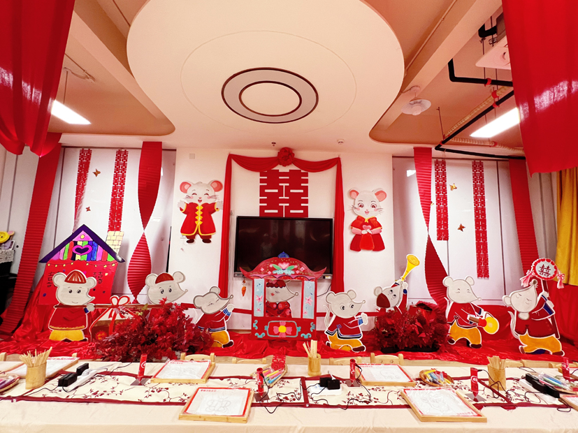 看,哪里來的鑼鼓聲,這么熱鬧,原來是小孩子喜氣洋洋,抬起了花轎。這個區域非常熱鬧,紅紅火火。抬花轎這個游戲出自《老鼠嫁女》繪本。由小朋友來演繹,有一番特別的滋味。有一個小朋友說,這是她第一次抬轎子,她的感受是要合作,轎子才會穩。四個人抬轎子,一定要齊心協力,才能夠穩當,小朋友在游戲中學到了知識。那么,這么有趣的小游戲是怎么設計出來的?據幼兒園老師胡夢佳介紹,平時和小朋友一起學習的時候,發現小孩子對《老鼠嫁女》這個繪本非常感興趣,里面有喜字,還有花轎,都是小孩子非常感興趣的,于是我們剛好通過六一繪本游樂活動,就結合起來了,讓孩子們感受傳統的嫁娶儀式,經典與童趣結合在一起,感覺非常棒!在“畫龍點睛”尋龍記游園館內,一條金燦燦的祥龍吸引住了小朋友,里面所有的內容都與龍有關。小朋友手中拿的也都是與龍有關的各種手工作品,有水墨畫龍的扇子,有拓印著龍的圖案的手工布袋,還有這個五顏六色的手工祥龍等等。