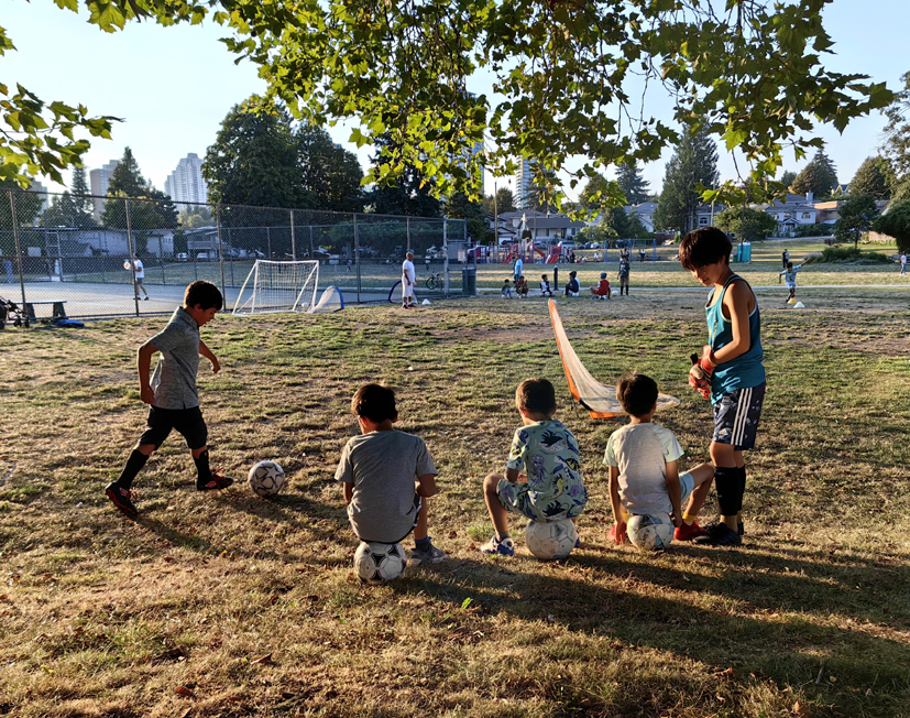 我沿著公園邊緣的步道散步,走了一圈下來,發(fā)現(xiàn)公園既沒有大門,也沒有圍欄和明顯的標(biāo)志性建筑物,只是僅僅在道路旁邊的草坪上立著一塊不起眼的牌子,上面寫著Ernie Winch Park,即溫奇公園。我想,還有什么標(biāo)志比得上這三四十畝的綠色生態(tài)公園更引人注目呢?不遠(yuǎn)處,只見兩撥孩子分別圍著兩名教練抑或家長在踢足球,眼前這二三十多名孩子的年齡大至為七八歲,烈日下個(gè)個(gè)汗流浹背、生龍活虎地穿梭馳騁在球場上。緊挨著的兩個(gè)網(wǎng)球場又是另一番景象,一名八九歲的女孩與她的父親在打網(wǎng)球,女孩揮舞著球拍,動(dòng)作嫻熟,扣球有力,儼然一位小專業(yè)運(yùn)動(dòng)員。一旁還有一對年輕夫妻陪著一個(gè)大約只有二歲左右的男孩玩足球,更有甚者的是,只見一個(gè)一歲多的男孩穿著尿布濕在音樂噴水廣場上被淋的濕漉漉的來回穿梭。此外,還有打排球、打乒乓球的,一些年齡更小的幼兒在家長的照看下玩滑滑梯、蕩秋千等。也有溜狗的、閑聊的、躺在草坪上聽音樂的。我的外孫和外孫女則與他的另一個(gè)同學(xué)騎著自行車在草坪上你追我趕,玩得不亦樂乎。在休息區(qū),一群大人和小孩圍著一個(gè)臨時(shí)攤點(diǎn)購物,我移步駐足觀看,原來是幾位母親分別帶著她們的孩子在賣Chips、Pocky等零食,一位母親告訴我:“從小培養(yǎng)孩子自食其力的能力及商業(yè)意識很重要,孩子有了健康的身體和商業(yè)頭腦,長大后就會有較好的發(fā)展前景。”讓我大跌眼鏡的是,這4名孩子中,年齡最小的居然只有6歲,最大的也才8歲,而這種商業(yè)體驗(yàn)兩年前就開始了。