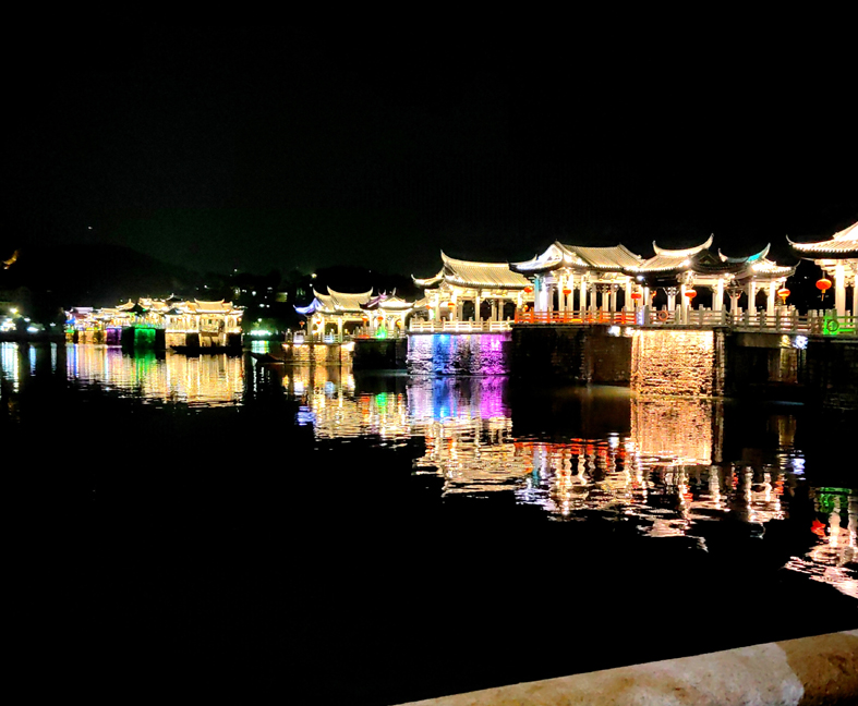 從牌坊街向南走不遠,穿過廣濟門,便至廣濟橋頭。江水漾著碧波,兩岸人頭攢動,游人絡繹不絕,接踵而至,靜待廣濟橋燈光啟幕。晚八時整,樂聲響起,韓山上的射燈與橋上的彩燈齊齊亮起,將整片江面映照得熠熠生輝。一艘專用船將十八艘小木船依次推送至指定位置,與石梁橋精準對接。彩燈輝映下,整座橋仿佛一條璀璨彩帶,在江面上翩然舞動,燈光隨著音樂旋律在橋體上流轉,與水中橋影交相輝映;光影循著樂聲節奏變幻,時而柔和溫婉,時而熱烈奔放,將這座古老的橋梁裝點得如夢似幻,令人目不暇接,美不勝收。想來,這便是潮州人紀念韓愈的一種美好方式吧。