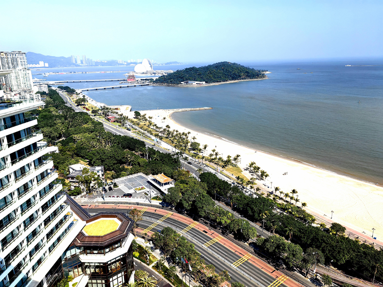 我們來到東人工島——又稱藍海豚島,這里是珠港澳三地的交匯點,登上觀景臺遠眺,港珠澳大橋如一條金色長龍,靜臥于伶仃洋碧波之上。徐劍先生指著前方不遠處向我介紹:“那就是香港口岸和香港國際機場,這里平均每分鐘就有一個航班起降,是世界上規模最大的機場之一。”我抬頭仰望,只見往來不息的飛機絡繹不絕,其數量不亞于高速公路上的汽車。我們移步到展廳,講解員指著巨幅的“港珠澳大橋總平面圖”和大橋整體模型,為我們詳細介紹這項超級工程的技術研發歷程和建設全貌。我駐足于碎石整平船“津平1”、起重船“振華30”等十余座工程單體模型面前,透過玻璃窗觀望,港珠澳大橋如一條堅實的紐帶,緊緊串聯起大灣區的過去與未來。