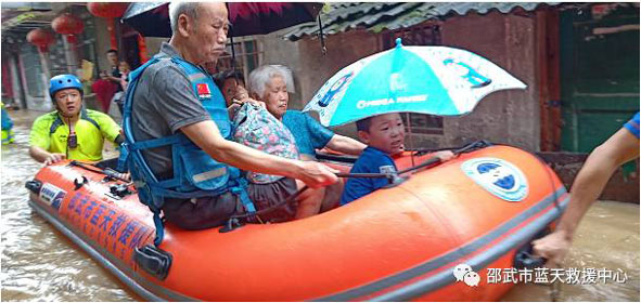藍(lán)天救援出動沖鋒艇奮力轉(zhuǎn)移群眾。