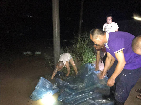 福建華至生態(tài)農(nóng)業(yè)公司黨員用木板及沙石堵住進(jìn)水口。