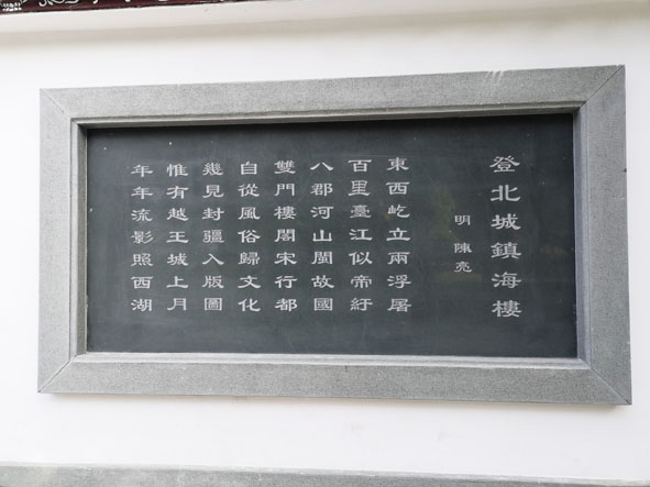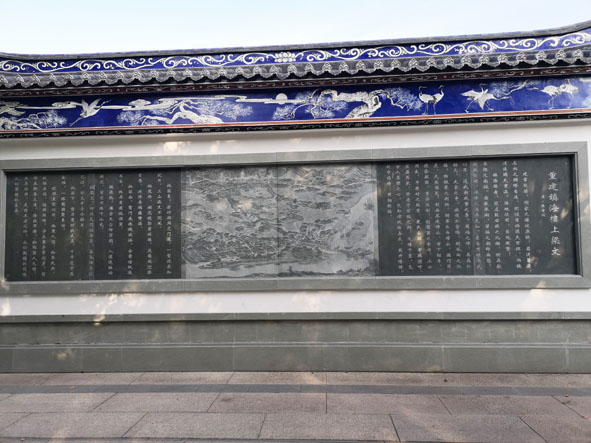 重建的鎮(zhèn)海樓比原來抬高了10米,登上這抬高的石階,來到一樓前,映入眼簾的是一塊鑲著一塊長約三米、寬約一米五的雙龍騰云駕霧的巨幅青石浮雕,栩栩如生,雙龍矯健威武。浮雕下方,還刻有一對(duì)如意。