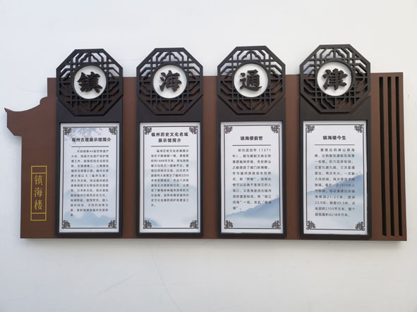 鎮(zhèn)海樓在原樣復(fù)制遺址舊貌的基礎(chǔ)上加建了地宮。“地宮”二層設(shè)計(jì)了一個(gè)珍寶館,館室地面鋪有青石板,墻上設(shè)有許多格子,每個(gè)格子里都陳列了福建特色的藝術(shù)品。“地宮”一層建成福州名城展示館,將福州城市演變歷史和建筑史濃縮其中。
