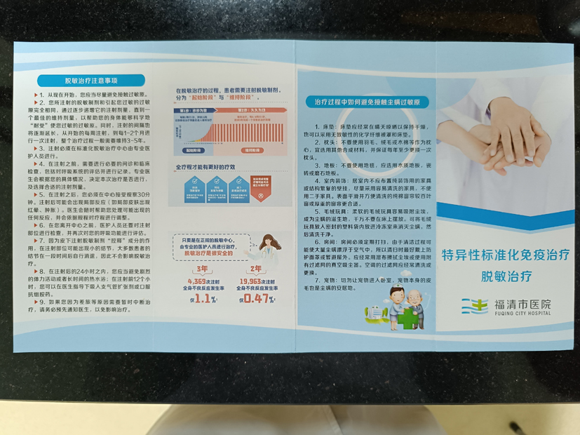福清市醫院耳鼻咽喉科變態反應室建于2008年至今已14年,開展了舌下免疫治療。在這基礎上,2021年以培育建科的形式成立了“過敏反應中心”,以耳鼻咽喉變態反應、呼吸變態反應、皮膚變態反應、小兒變態反應等多個亞專業學科進行聯合診療。同年被列為“中國過敏學科優秀核心團隊建設單位”,并加入了以中華預防醫學會過敏病預防與控制專業委員會為指導單位發起的“福建省兒童過敏性疾病??坡撁?rdquo;,是福州市醫學會變態反應學分會的掛靠單位?,F科室建有獨立實驗室,配備國際“金標準”的賽默飛Phadia全自動體外過敏原檢測系統、皮膚點刺體內檢測、肺功能、心電監測儀、電子鼻-鼻咽喉鏡等先進儀器設備,進行標準化特異性免疫治療、室內外過敏原環境監測等.過敏反應中心開展的皮下特異性免疫治療(即脫敏治療)是世界衛生組織認可的唯一可能改變過敏性疾病自然進程的對因治療方法,這種療法還能預防新發的過敏原,對于兒童而言還可以預防過敏性鼻炎進展為過敏性哮喘,是廣大過敏性疾病患者的福音。